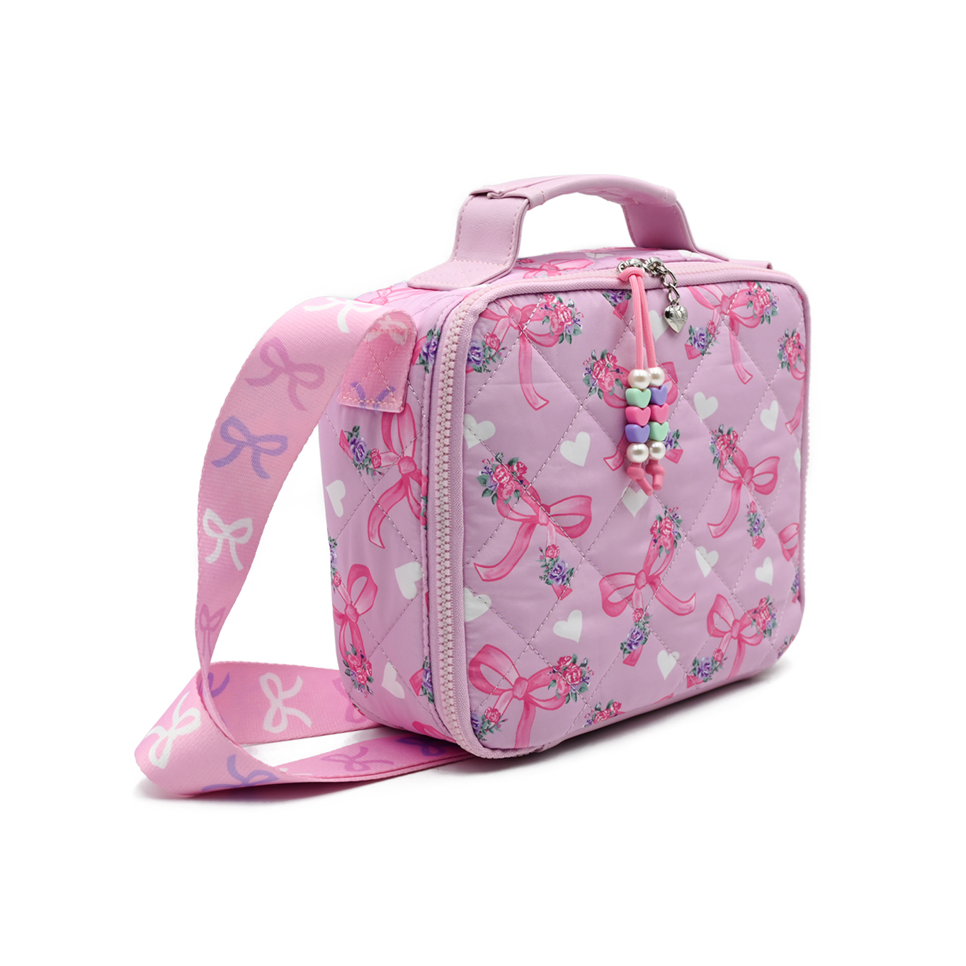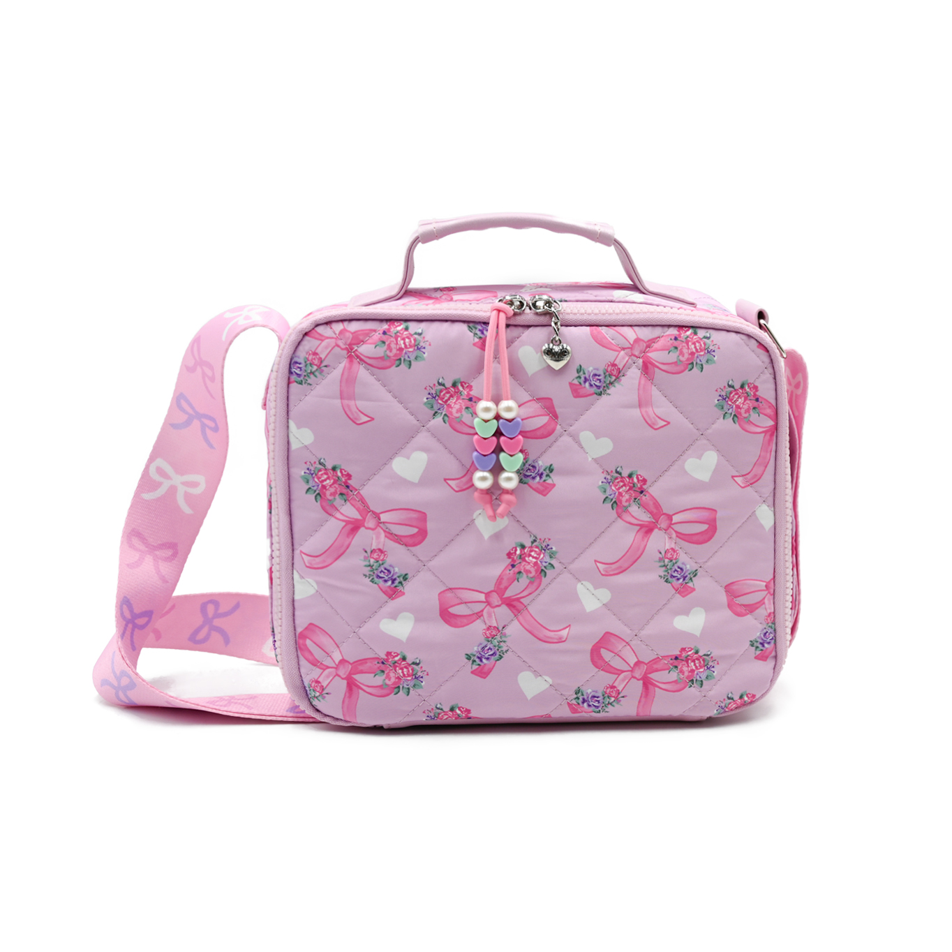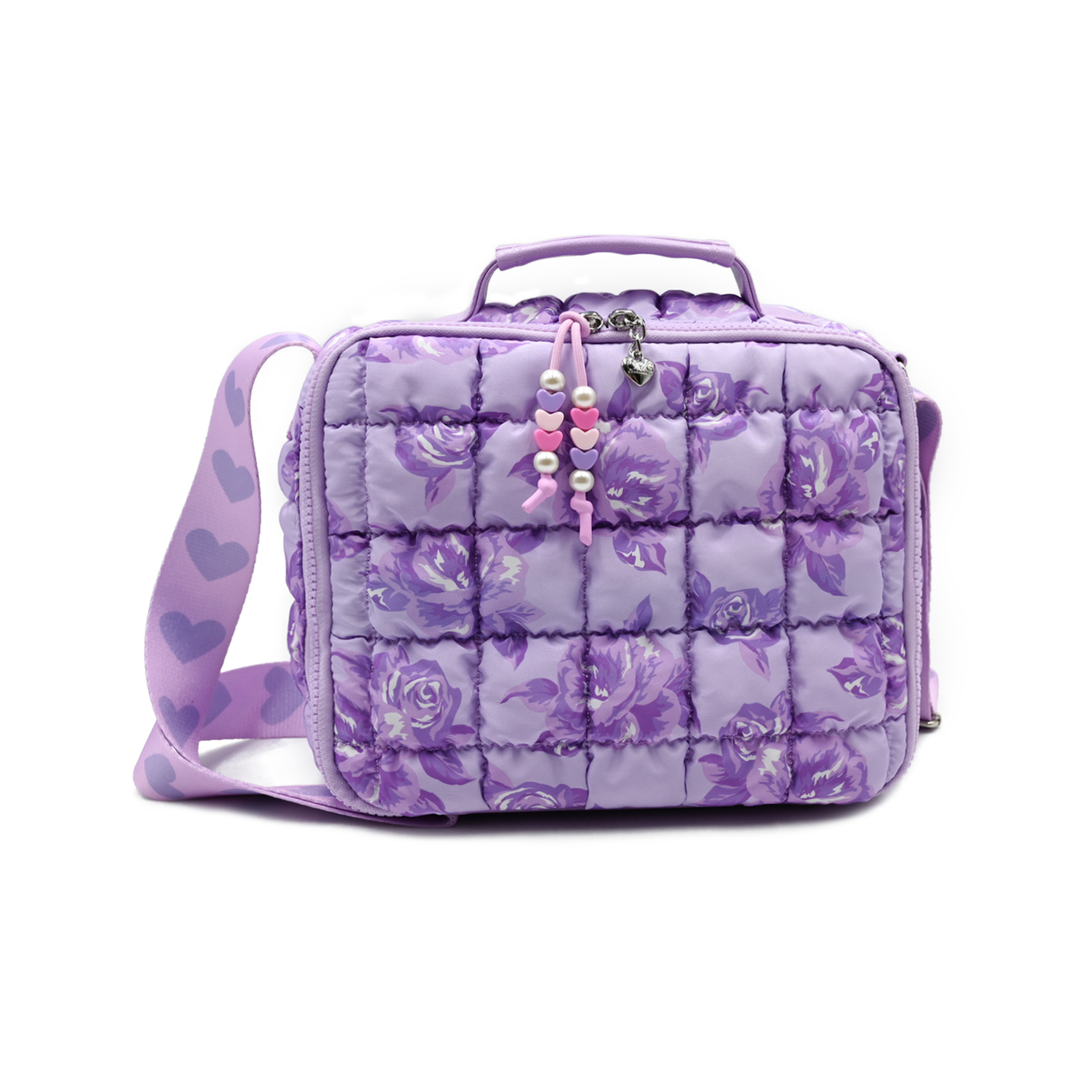 - Scrunched to perfection, our new nylon quilted & insulated lunch bags are here to carry all their snacks & meals! This super styling lunch caddy features a silver metallic exterior, beaded zipper pulls, & printed adjustable shoulder strap for easy carrying!