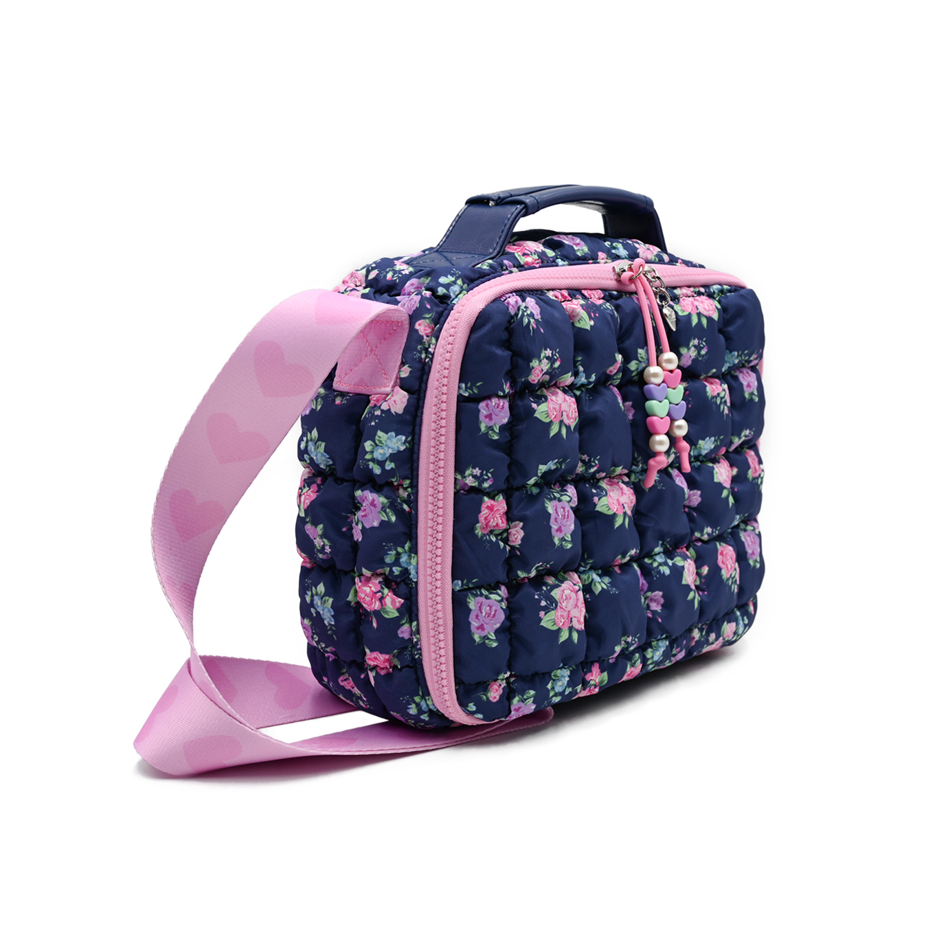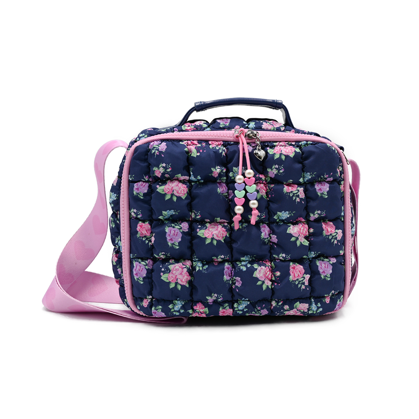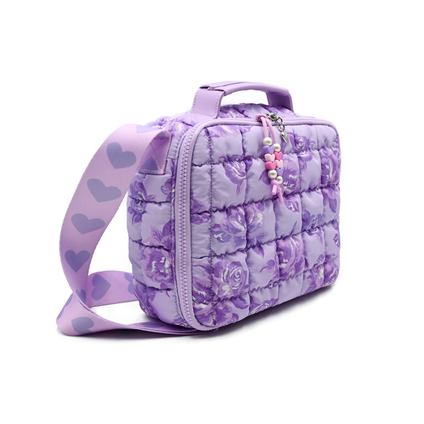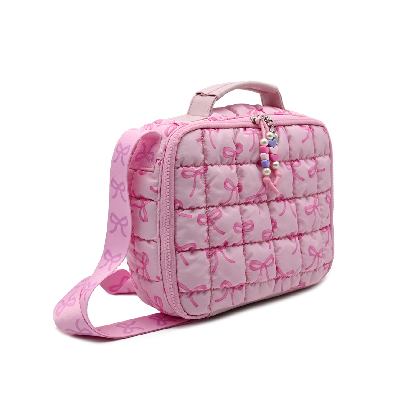 - Scrunched to perfection, our new nylon quilted & insulated lunch bags are here to carry all their snacks & meals! This super styling lunch caddy features a silver metallic exterior, beaded zipper pulls, & printed adjustable shoulder strap for easy carrying!