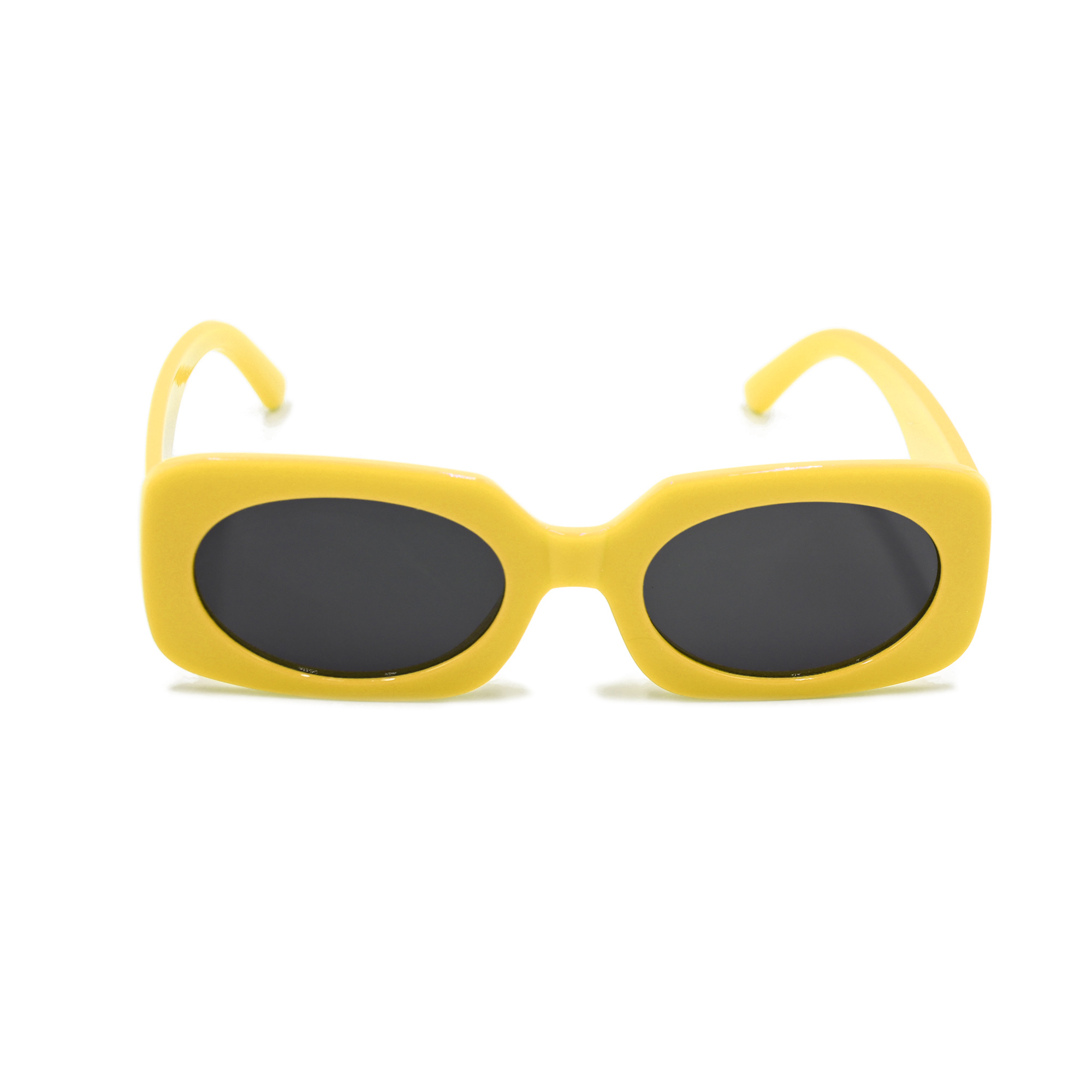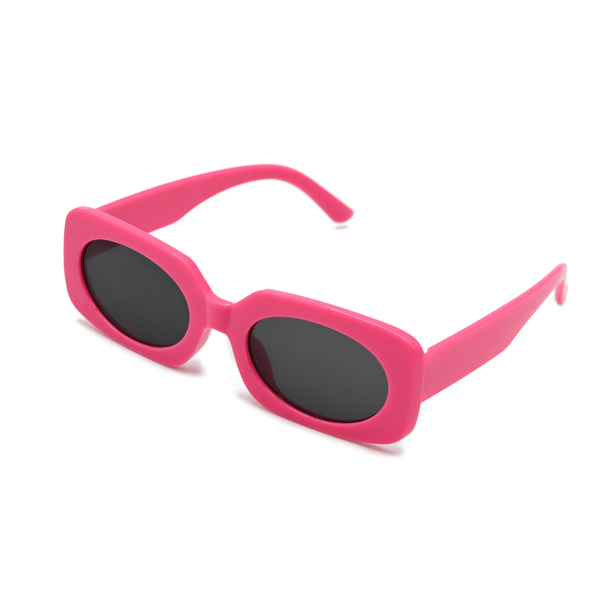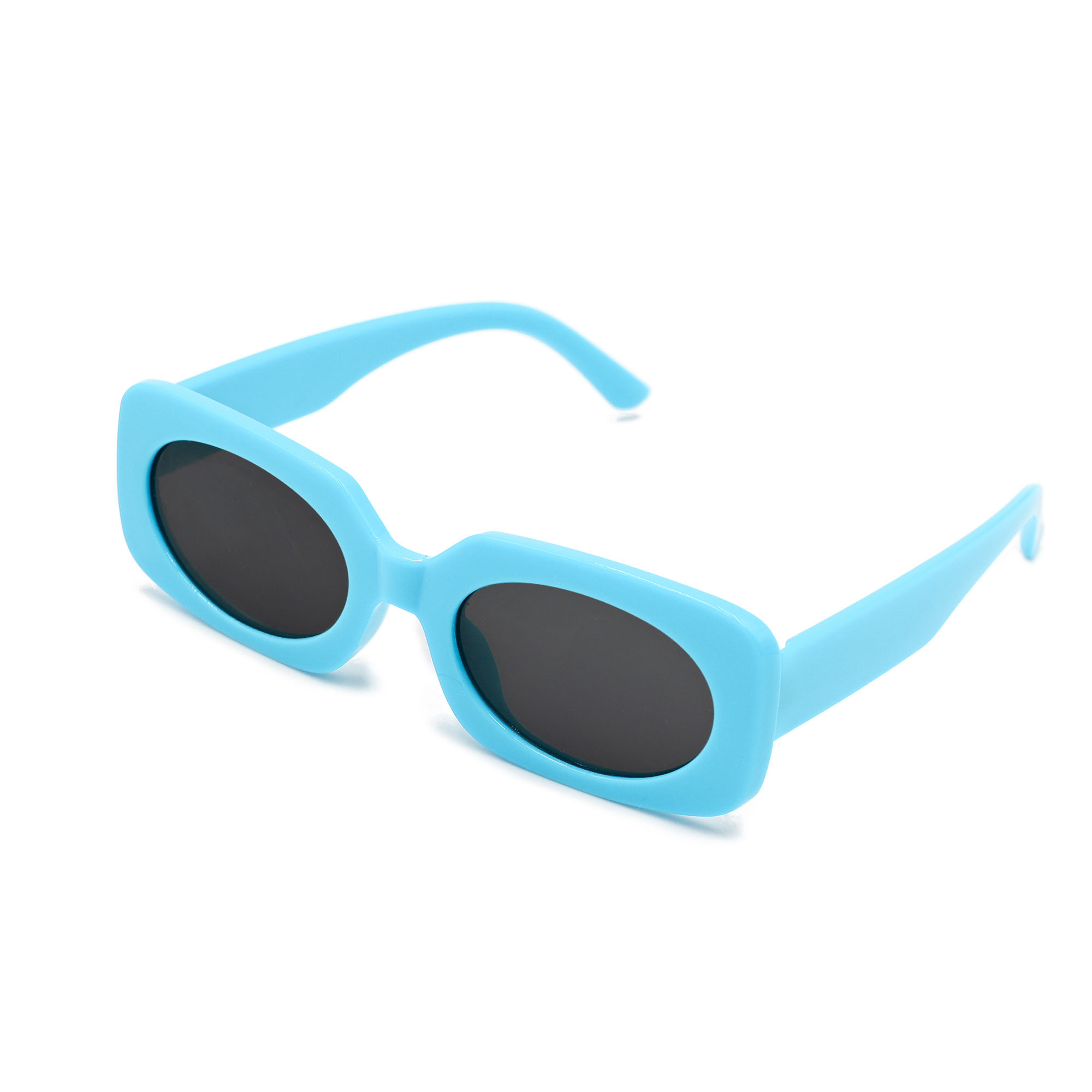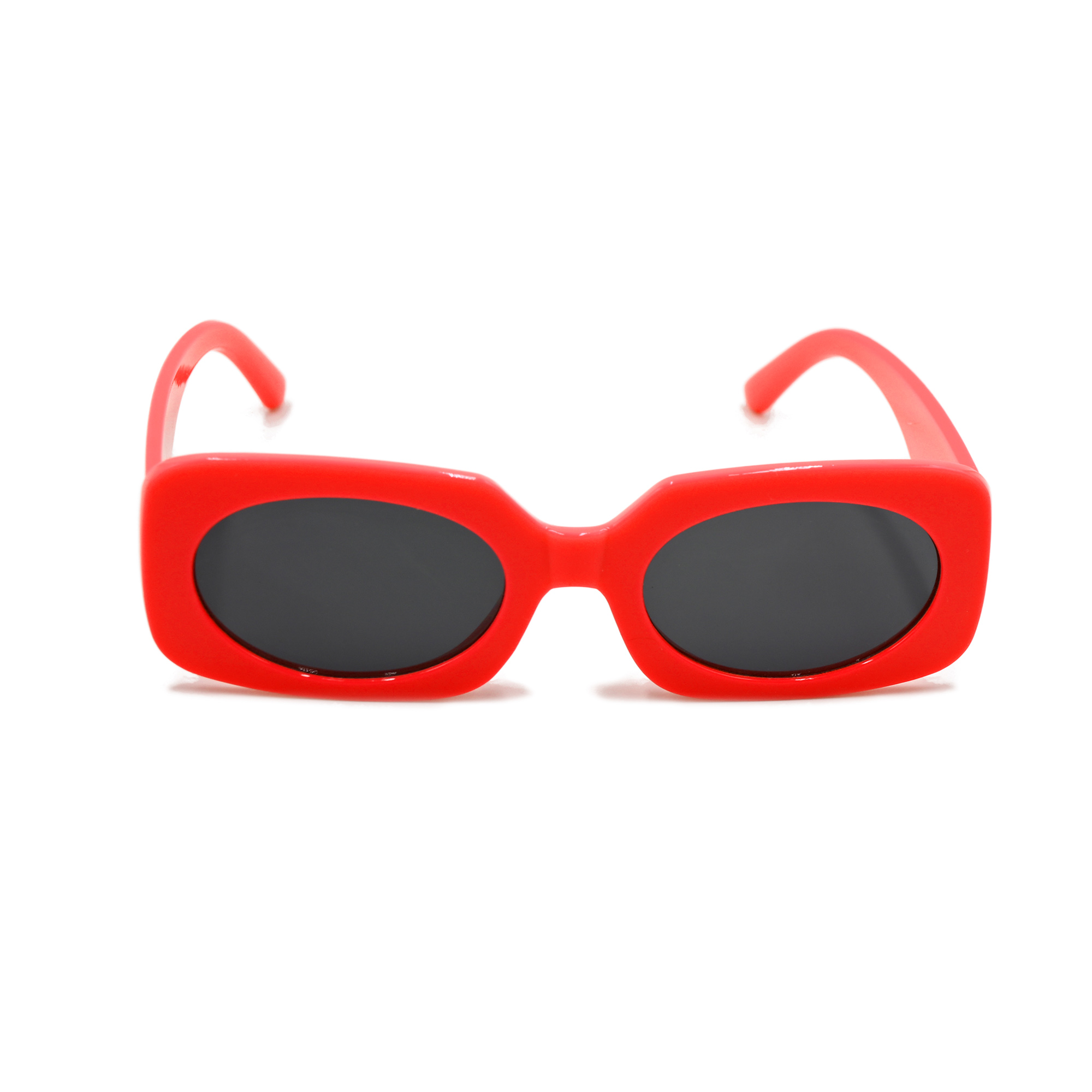 - Plastic sunglasses with wide frames and UV-protective, tinted lenses.