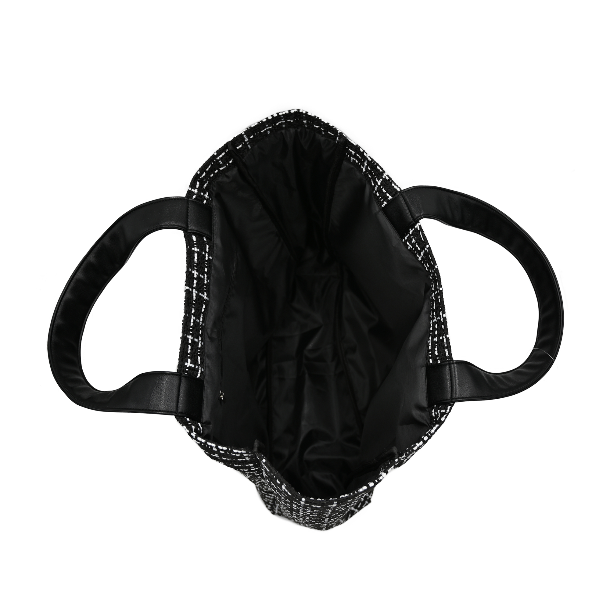 • Crafted with intricate black and white tweed detailing, this tote boasts a timeless design that effortlessly complements any outfit.