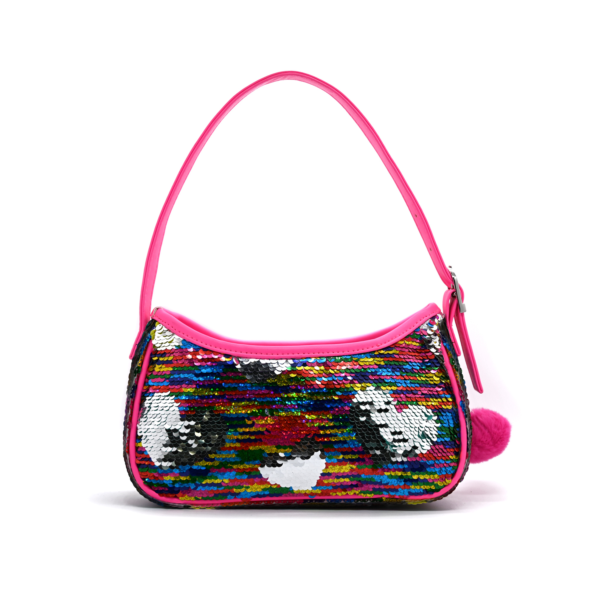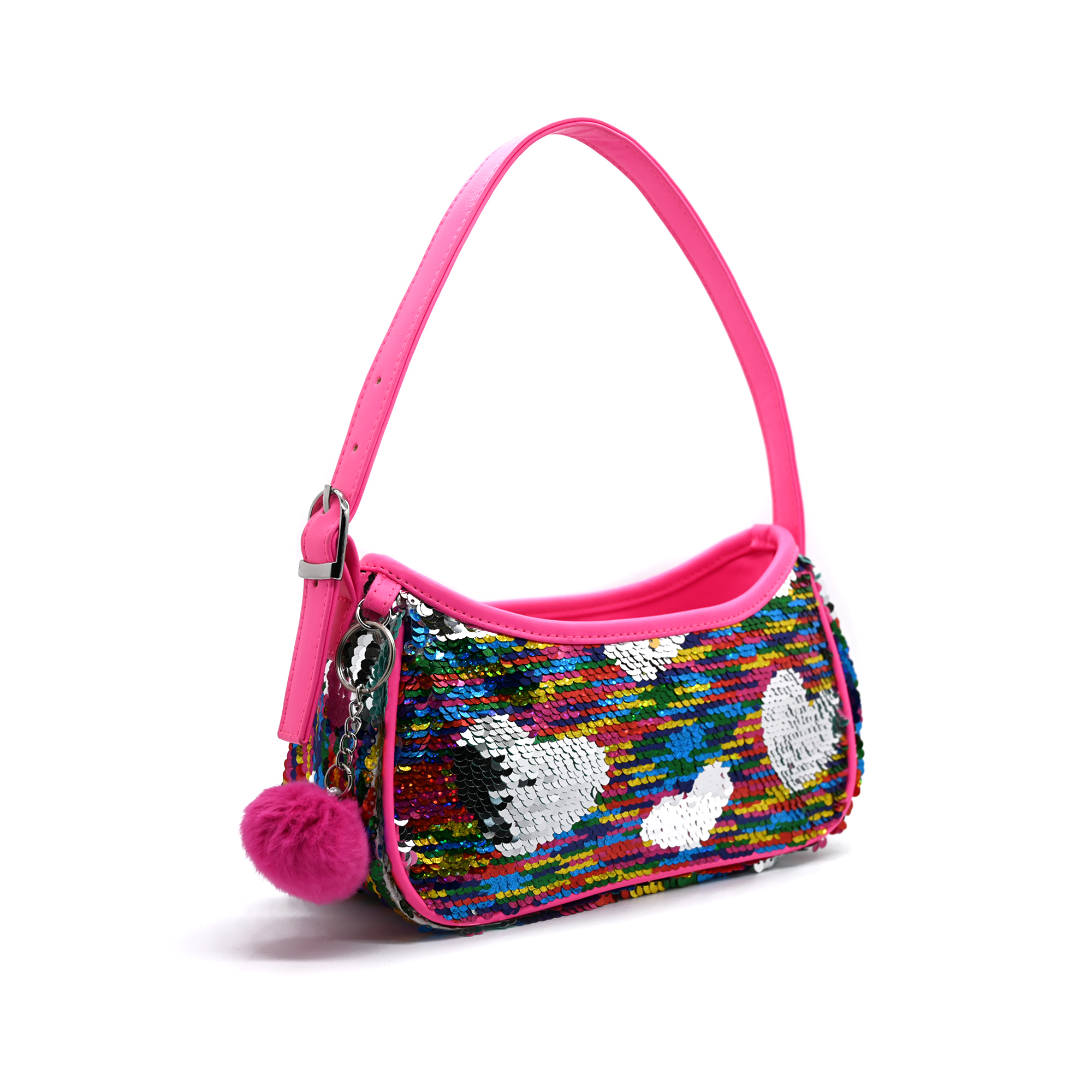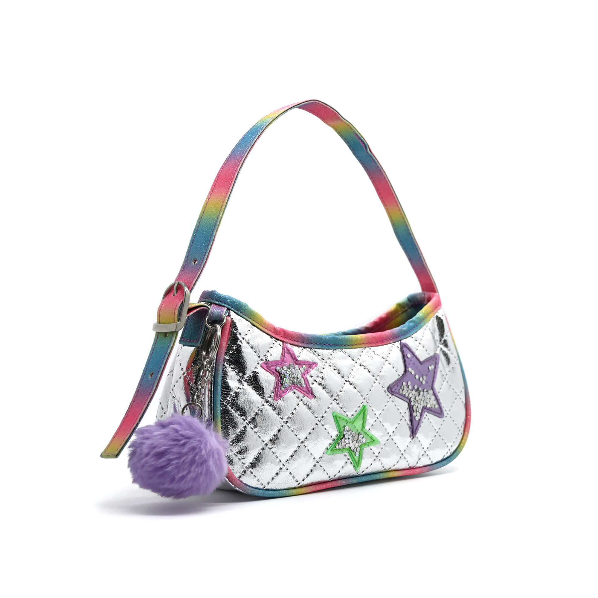 • Shoulder bag with zipper, in rainbow colors, with sequins and star-shaped patches sewn .